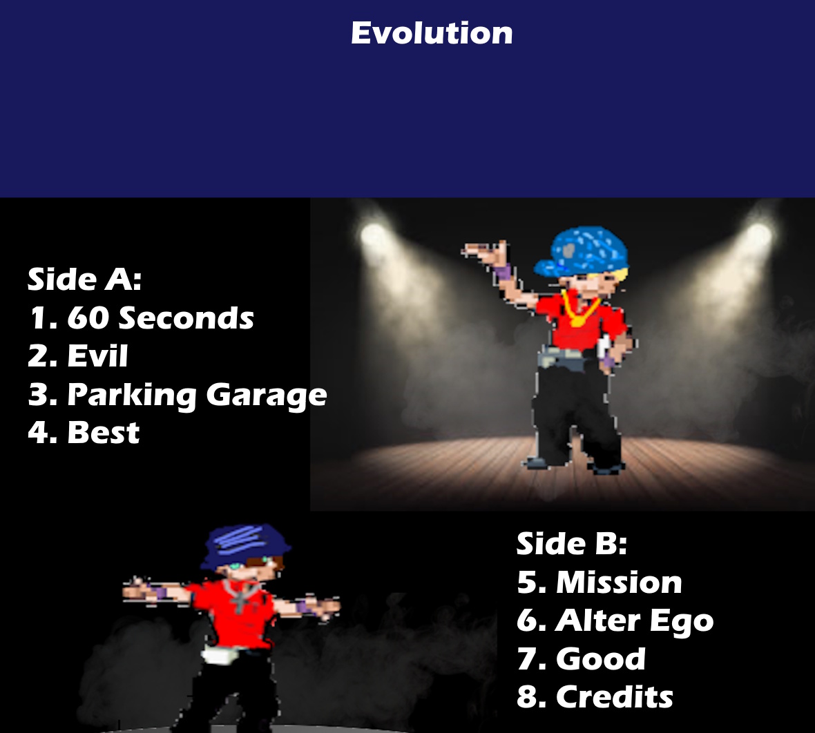 This 8-track masterpiece takes you on a journey through growth, resilience, and pure artistry. From hard-hitting anthems to soulful melodies, every song is a chapter in the story of progress. Crafted for listeners who crave authenticity and innovation, “Evolution” is more than music—it’s a movement.